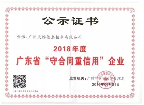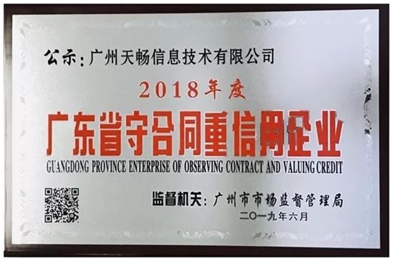 企業(yè)的信用至高無上,2019年6月廣州天暢信息技術(shù)有限公司榮獲2018年度“廣東省守合同重信用企業(yè)”稱號(hào)。這是榮譽(yù),是期待,更是一種責(zé)任。
