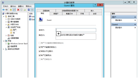操作流程:進(jìn)入“控制面板->管理工具->計算機(jī)管理->本地用戶和組->用戶->Guest”“賬戶已禁用”打勾啟用: