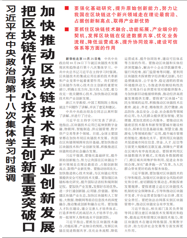 10月24日下午,中共中央政治局進行了第十八次集體學習。中共中央總書記習近平在主持學習時強調,區(qū)塊鏈技術的集成應用,在新的技術革新和產(chǎn)業(yè)變革中起著重要作用,要把區(qū)塊鏈作為核心技術自主創(chuàng)新的重要突破口,加快推動區(qū)塊鏈技術和產(chǎn)業(yè)創(chuàng)新發(fā)展。