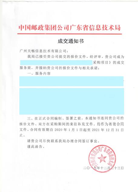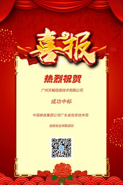 新年伊始,萬花初綻,希望升騰,廣州天暢信息技術有限公司憑借雄厚的技術實力以及良好的市場信譽,在眾多競爭對手中脫穎而出成功中標中國郵政集團公司廣東省信息技術局信息安全項目。