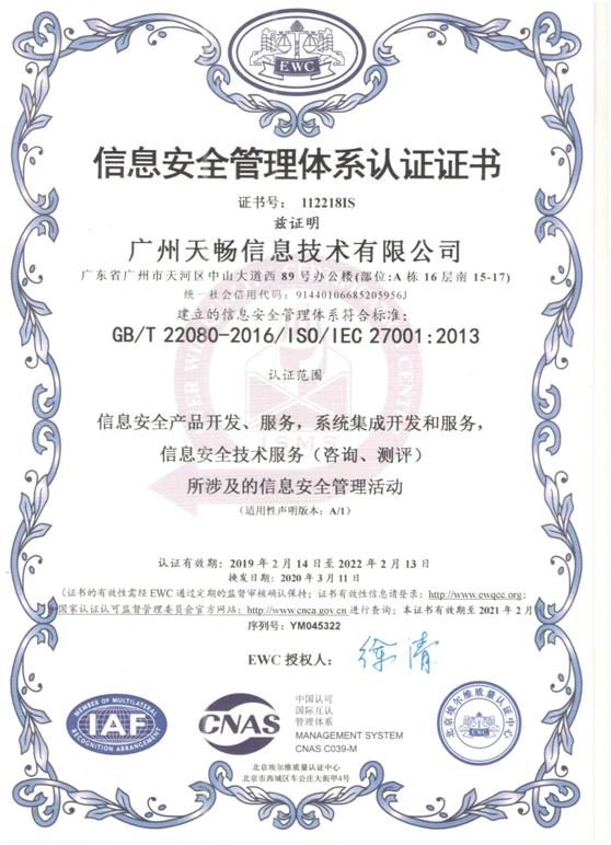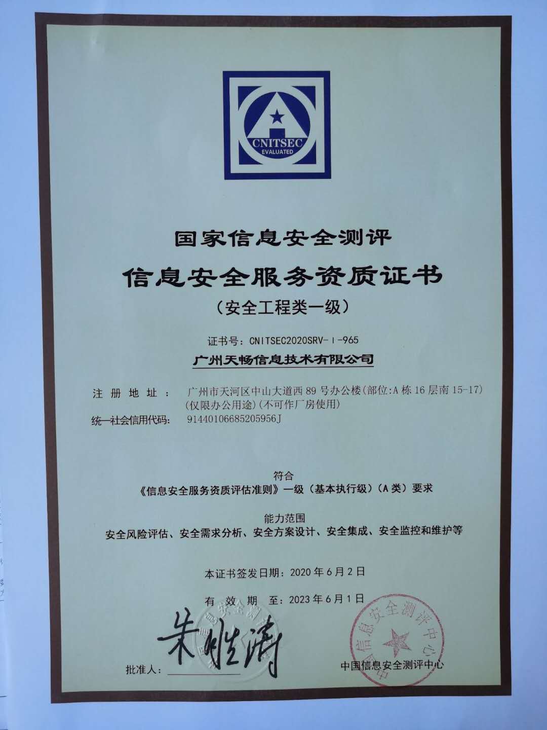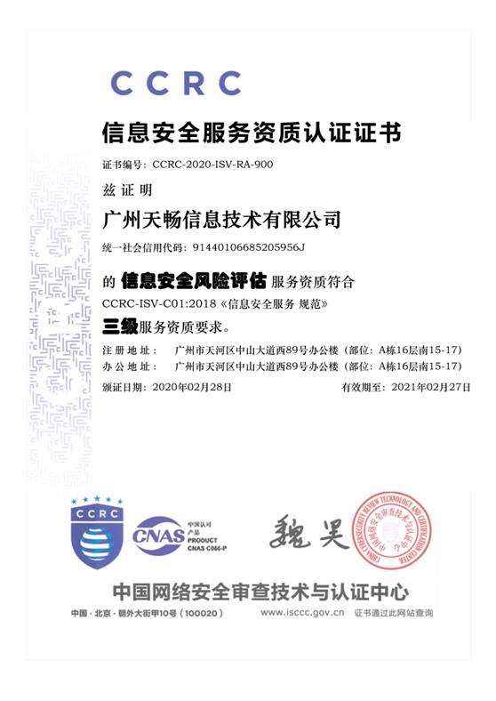 我們承接完成了一系列具有行業(yè)示范的信息安全服務(wù)項(xiàng)目,通過了解最新的技術(shù)發(fā)展趨勢,把國內(nèi)外的先進(jìn)技術(shù)和產(chǎn)品用一流的服務(wù)帶給用戶。基于多年安全服務(wù)行業(yè)經(jīng)驗(yàn),天暢信息獲得了ISO9001質(zhì)量管理體系認(rèn)證證書、ISO27000信息安全管理體系認(rèn)證證書、CCRC信息安全風(fēng)險評估三級服務(wù)資質(zhì)(發(fā)證機(jī)構(gòu):中國網(wǎng)絡(luò)安全審查技術(shù)與認(rèn)證中心)、信息安全服務(wù)資質(zhì)證書安全工程類一級(發(fā)證機(jī)構(gòu):中國信息安全測評中心)等服務(wù)資質(zhì)證書。