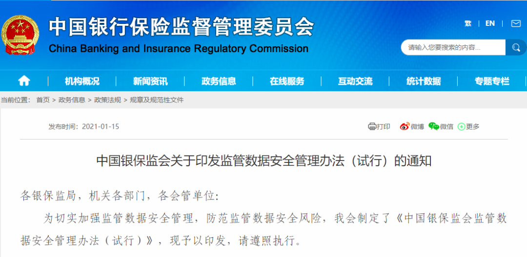 中國(guó)銀保監(jiān)會(huì)監(jiān)管數(shù)據(jù)安全管理辦法